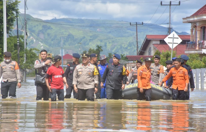 Selanjutnya Wakapolda beserta rombongan memberikan langsung dengan turun ke lokasi Banjir kepada warga yang masih terdampak Banjir dengan menggunakan 2 unit Perahu karet dan berjalan kaki menuju rumah warga.