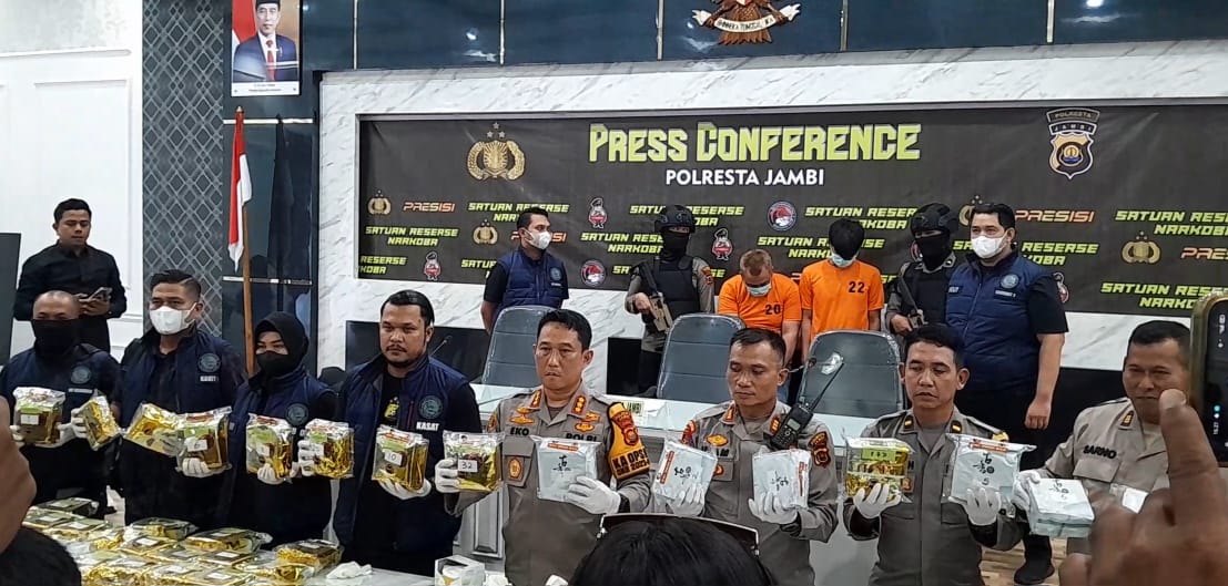JAMBI.PILARDAERAH.COM – Satresnarkoba Polresta Jambi berhasil mengungkap jaringan internasional narkotika. Tidak main-main, barang bukti yang berhasil diamankan sebanyak 52,4 kg narkotika jenis sabu-sabu.
