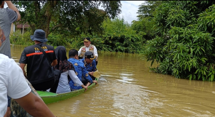 Dengan menggunakan perahu Gubernur Al Haris meninjau kondisi warga dan memberikan bantuan langsung ke rumah warga yang terdampak banjir.
