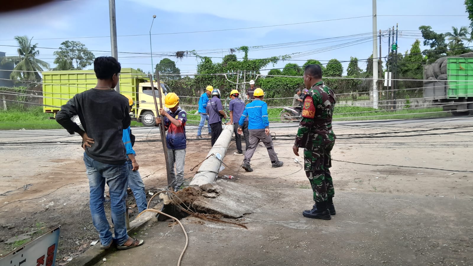 Babinsa Serda Anton P Manalu mengatakan, guna mengatasi kelancaran serta keamanan warga untuk berkendara, kita bersama petugas PLN Kota baru dan warga masyarakat bahu membahu melakukan evakuasi 2 tiang listrik yang tumbang dengan menggunakan alat berat.