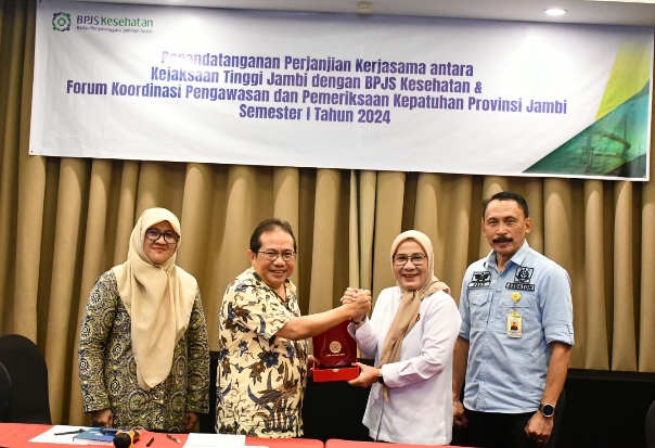 JAMBI.PILARDAERAH.COM — Plt Kajati Jambi Enen Saribanon tanda tangani kerjasama bidang perdata dan tata usaha negara dengan BPJS Kesehatan Kedeputian II Wilayah Sumbagteng, Rabu (20/3/2024).