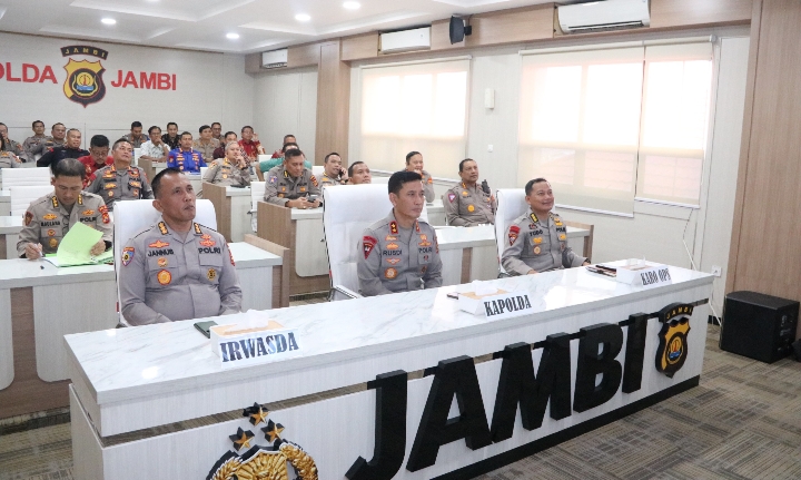 Tampak mengikuti zoom mendampingi Kapolda Jambi, yakni Irwasda Polda Jambi Kombes Pol Jannus Parlindungan Siregar, Para Pejabat Utama Polda Jambi, dan Para Kasubbid Bidang Polda Jambi