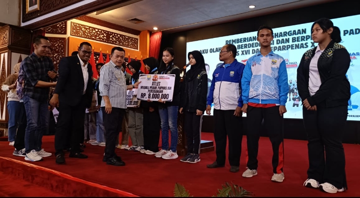 JAMBI.PILARDAERAH.COM – Gubernur Jambi DR H Al Haris S Sos MH menyerahkan bonus kepada pelaku olahraga berdedikasi dan berprestasi pada Pekan Olahraga Pelajar Nasional (Popnas) XVI dan Pekan Paralimpik Pelajar Nasional (Peparpenas) X yang berlangsung di Sumatera Selatan Tahun 2023 lalu.