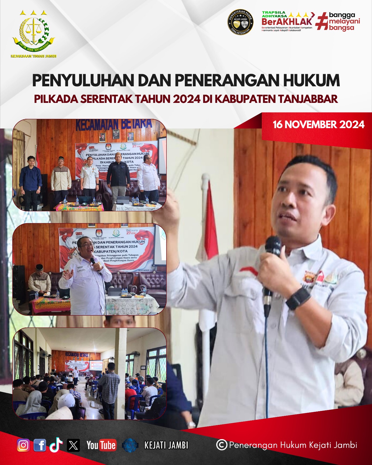 JAMBI.PILARDAERAH.COM — Dalam rangka mendukung kelancaran dan kesuksesan Pilkada Serentak 2024, Kejaksaan Tinggi (Kejati) Jambi bekerja sama dengan Komisi Pemilihan Umum (KPU) Provinsi Jambi menggelar kegiatan Penerangan Hukum di 11 Kabupaten/Kota Se-provinsi Jambi.