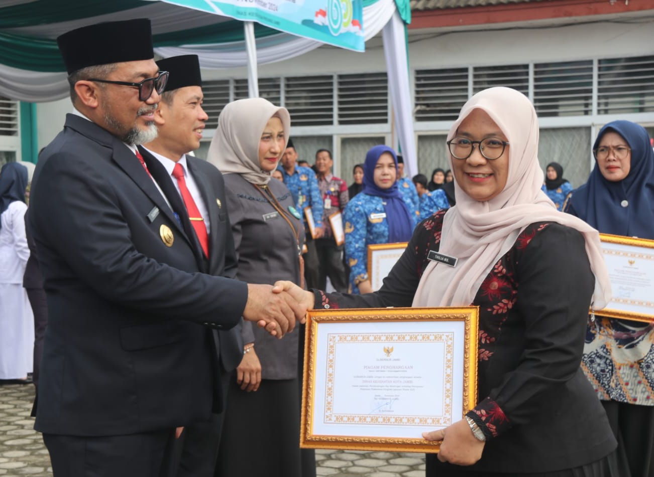 Pada kegiatan ini Pjs. Gubernur Sudirman juga menyerahkan piagam penghargaan kepada Rumah Sakit Umum Daerah (RSUD) Raden Mattaher Jambi atas pencapaian penemuan kasus terduga TBC terbanyak tingkat Provinsi Jambi tahun 2024 dan penghargaan lainnya.