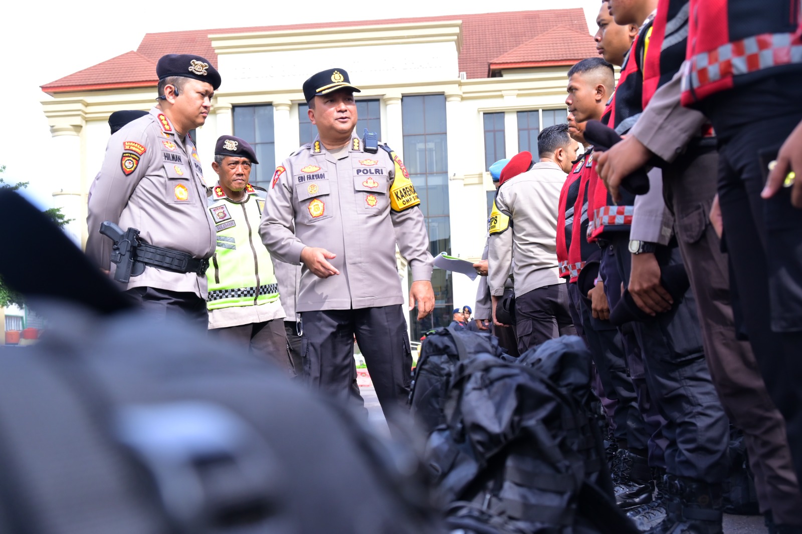 Setelah diberikan pengarahan dari Karo Ops Polda Jambi, dilakukan pemeriksaan kelengkapan personil, meliputi sikap tampang, kelengkapan individu, tas, pakaian, jas hujan, dan tongkat pembagian dinas.
