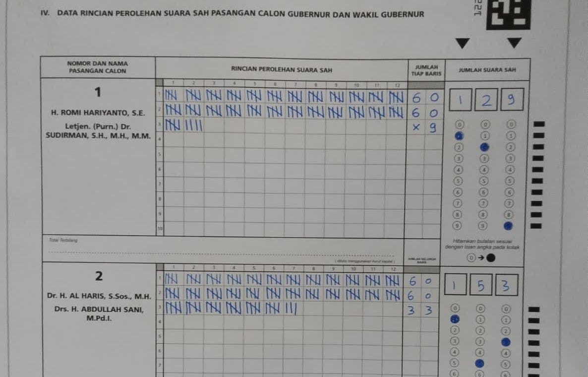 Dari hasil penghitungan suara di TPS itu, yang telah dimasukkan ke dalam formulir C1, tampak Pasangan Calon nomor urut 2 Al Haris-Sani unggul dengan memperoleh 153 suara sedangkan pasangan RH-Sudirman hanya meperoleh 129 suara.