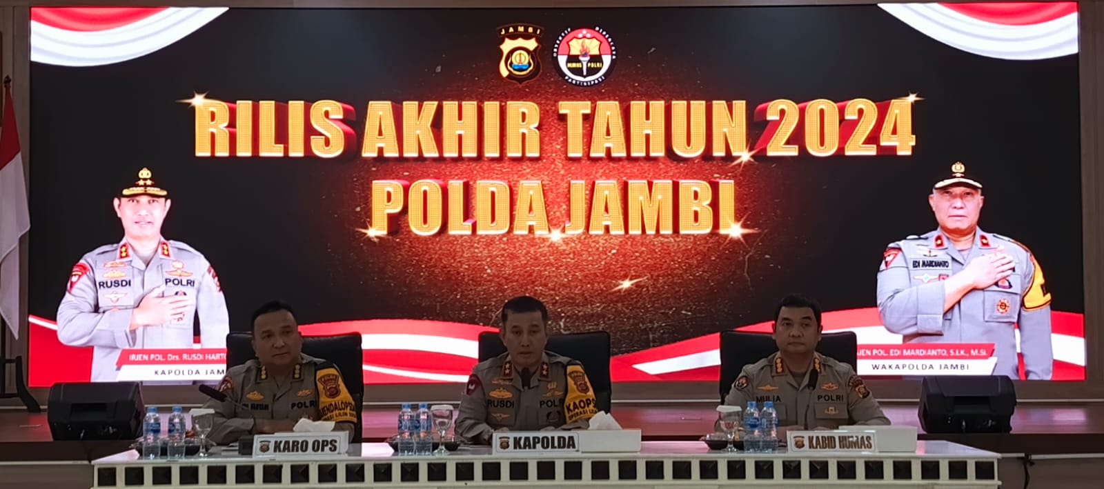 JAMBI.PILARDAERAH.COM — Kapolda Jambi Irjen Pol Rusdi Hartono yang memimpin langsung pers rilis akhir tahun di Gedung Siginjai Lantai 3, Mapolda Jambi, Senin (30/12/2024).