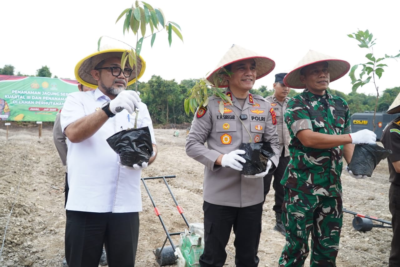 Kemudian Kapolda Jambi bersama Sekda Sudirman melakukan Penanaman Jagung Serentak Kuartal III dan Penanaman Jagung di Lahan Perhutanan Sosial secara simbolis dan diakhiri dengan menanam pohon dilokasi tersebut.