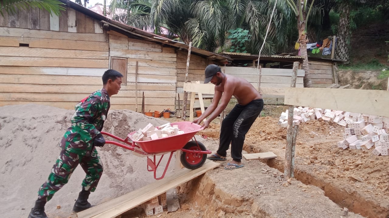 Dalam kesempatan tersebut, Babinsa tidak hanya berdialog, tetapi juga turut bekerja langsung bersama warga, mengangkat bahan bangunan dan membantu proses pembangunan.