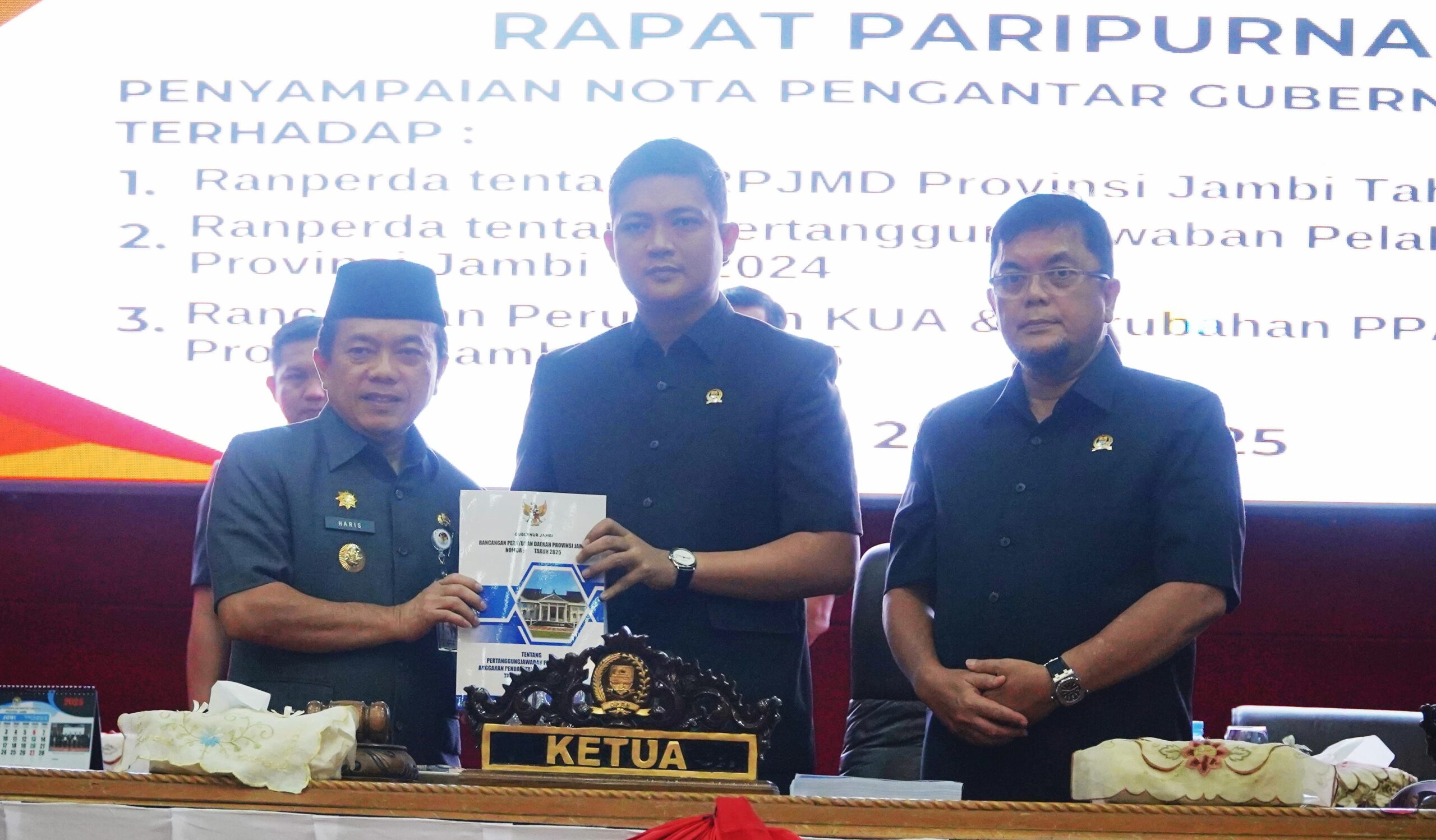 JAMBI.PILARDAERAH.COM — Gubernur Jambi Dr. H. Al Haris, S.Sos., MH menyampaikan Nota Pengantar Ranperda tentang Rencana Pembangunan Jangka Menengah Daerah (RPJMD) Provinsi Jambi Tahun 2025-2029, Ranperda Pertanggungjawaban Pelaksanaan Anggaran Pendapatan dan Belanja Daerah (APBD) Provinsi Jambi Tahun Anggaran 2024, dan Rancangan Perubahan Kebijakan Umum Anggaran (KUA) dan Perubahan Prioritas dan Plafon Anggaran Sementara (PPAS) Tahun Anggaran 2025 pada Rapat Paripurna Dewan Perwakilan Rakyat Daerah (DPRD) Provinsi Jambi, bertempat di Ruang Utama Sidang Paripurna DPRD Provinsi Jambi, Jum’at (25/07/2025) malam.