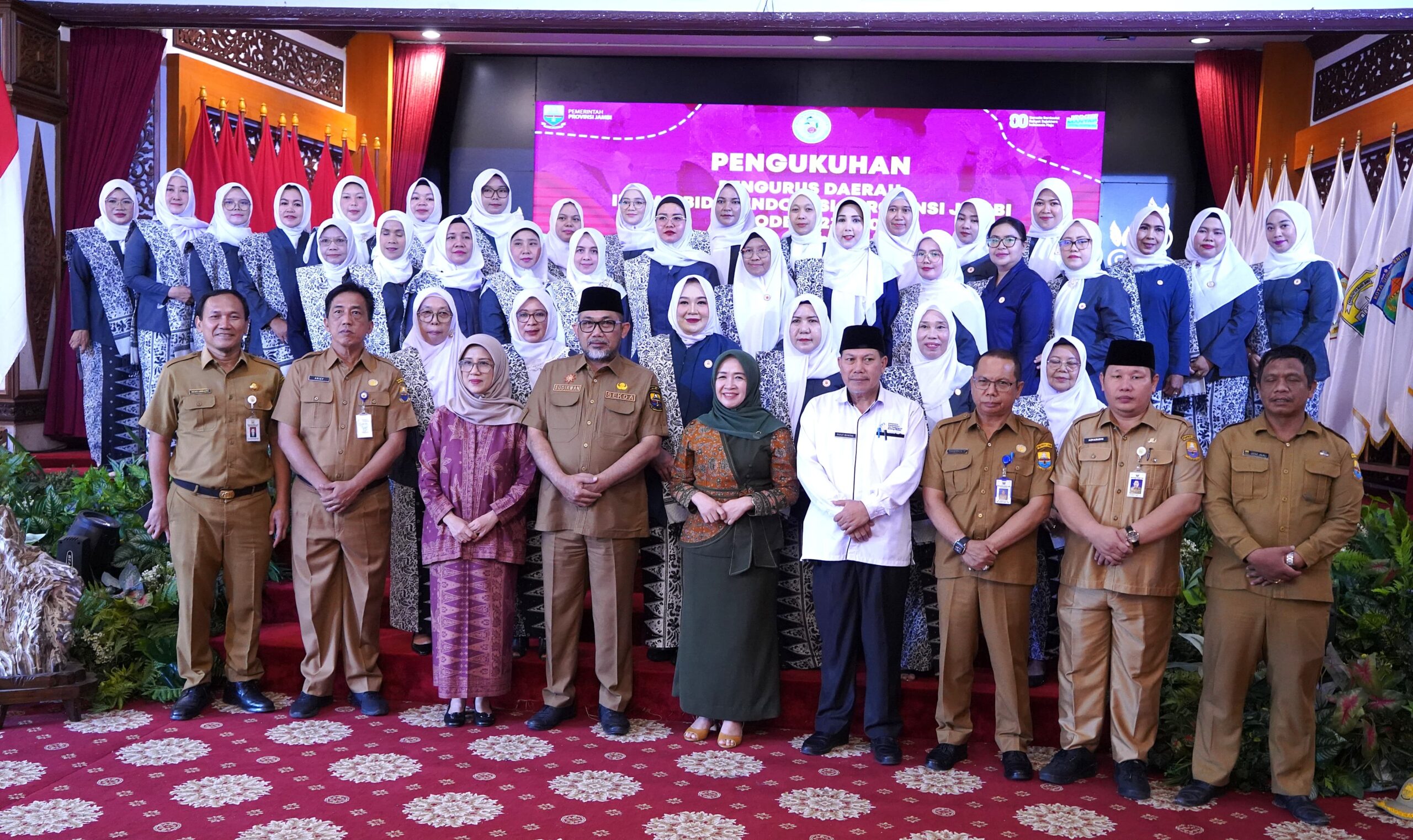 Pengurus Daerah Ikatan Bidan Indonesia Provinsi Jambi ini dikukuhkan Gubernur Jambi yang diwakili oleh Sekretaris Daerah (Sekda) Provinsi Jambi Dr. H. Sudirman, SH., MH. Pengukuhan ini turut dihadiri juga Kepala BKKBN Provinsi Jambi Drs. Putut Riyatno, M.Kes, Plt. Kepala Dinas Kesehatan Provinsi Jambi Drs. Saprimail Harahap, M.Kes, Direktur RSUD Raden Mattaher Jambi Dr. dr. Herlambang, Sp.OG, KFM, Ketua DWP Provinsi Jambi Hj. Iin Kurniasih Sudirman, para Kepala OPD terkait dan undangan lainnya.