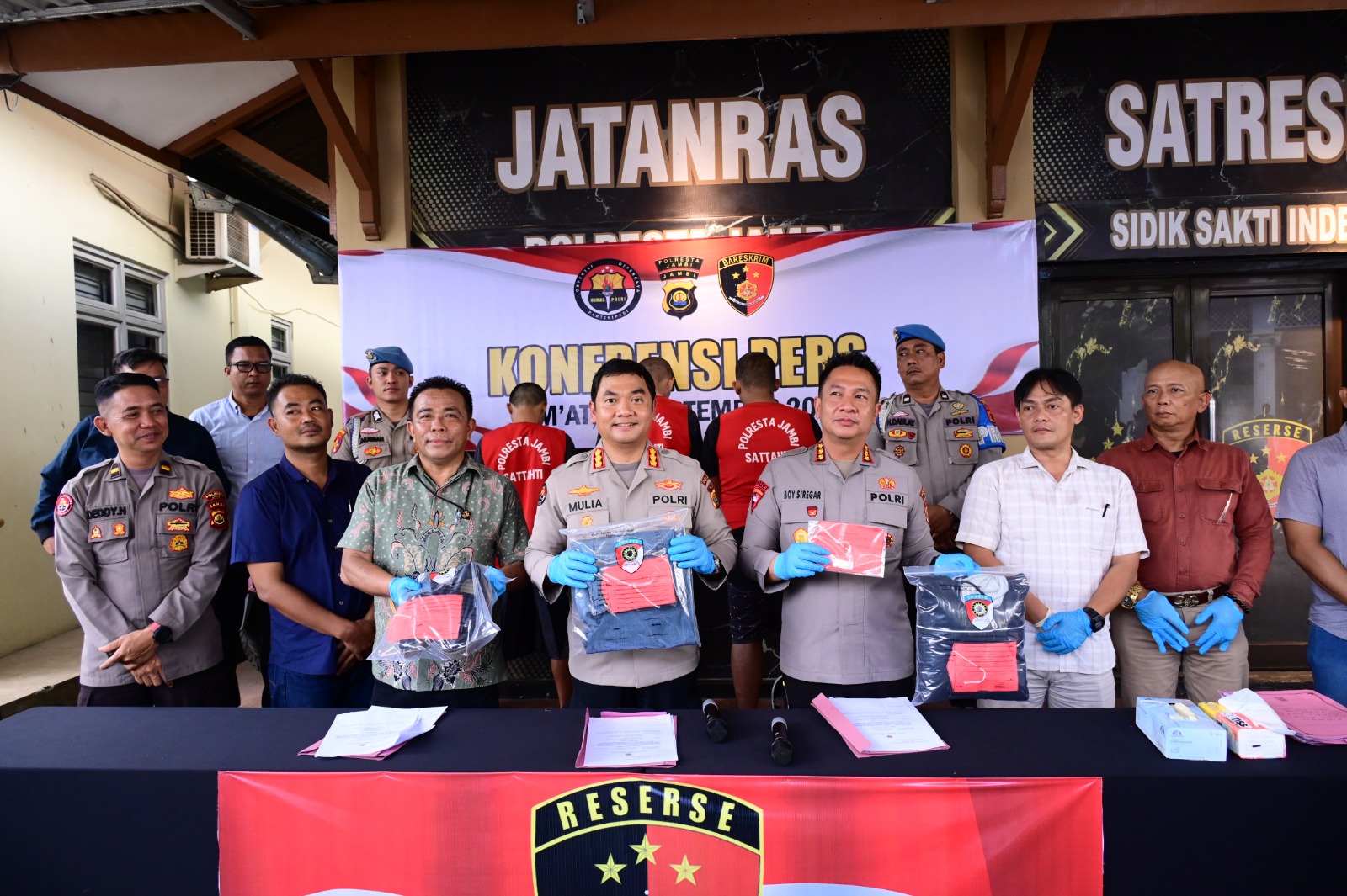 JAMBI.PILARDAERAH.COM — Kabid Humas Polda Jambi Kombes Pol. Mulia Prianto di dampingi oleh Kapolresta Jambi Kombes Pol. Boy Siregar melaksanakan konferensi pers ungkap kasus pencurian dengan pemberatan yang dilakukan saat aksi unjuk rasa DPR pada tanggal 29 Agustus 2025.