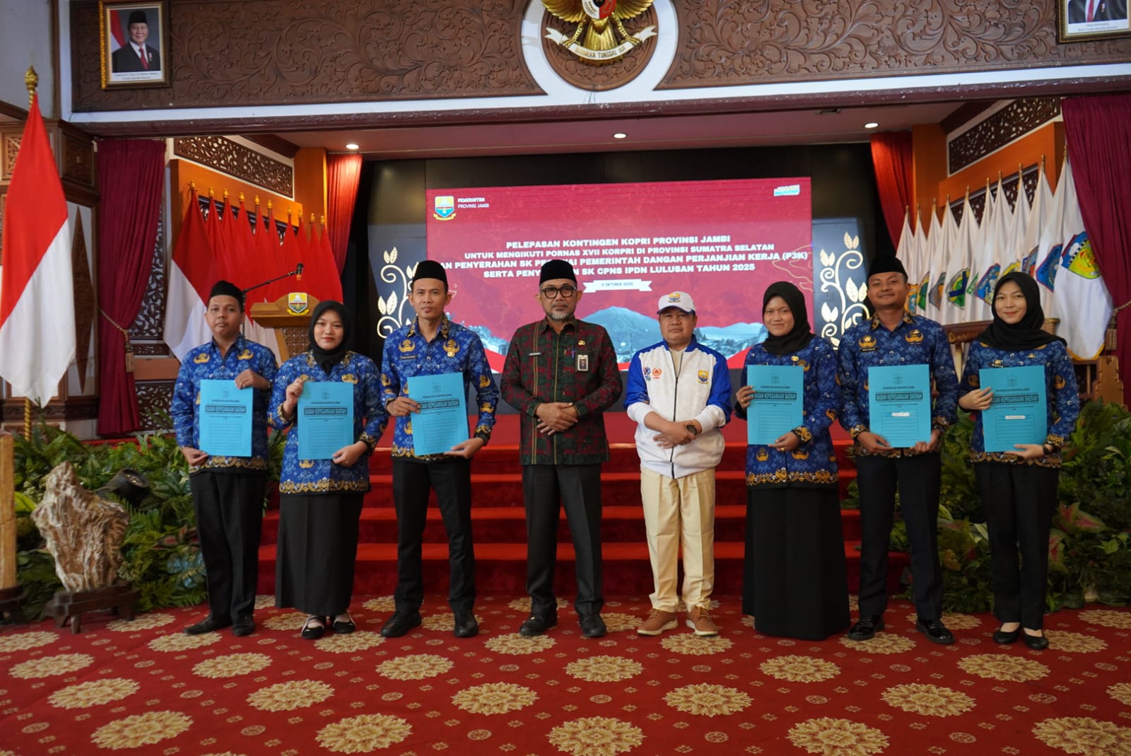 Harapan tersebut disampaikannya saat Pelepasan Kontingen/Atlet Korpri Provinsi Jambi Dalam Rangka PORNAS XVII KORPRI Tahun 2025 di Sumatera Selatan dan Penyerahan Surat Keputusan Pegawai Pemerintah Dengan Perjanjian Kerja (PPPK), serta penyerahan SK CPNS IPDN Lulusan Tahun 2025, bertempat di Auditorium Rumah Dinas Gubernur Jambi, Kamis (02/10/2025) Pagi.