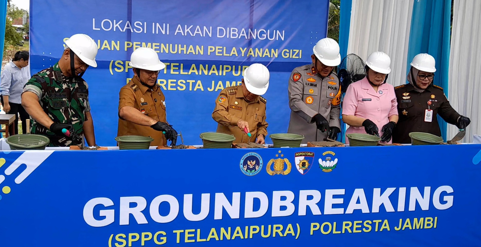 Rangkaian kegiatan dilanjutkan dengan peletakan batu pertama pembangunan SPPG Telanaipura Polresta Jambi dan foto bersama.