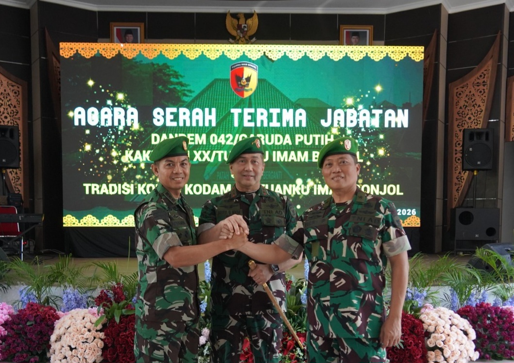 SUMBAR.PILARDAERAH.COM – Panglima Kodam XX/TIB Mayjen TNI Arief Gajah Mada, S.E., M.M., memimpin langsung upacara serah terima jabatan Komandan Korem 042/Garuda Putih dari Brigjen TNI Heri Purwanto, S.E., M.Sc., kepada Kolonel Inf Nyamin, S.I.P., M.M., bertempat di Makodam XX/TIB, Padang, Sumatera Barat, Senin (26/01/2026).
