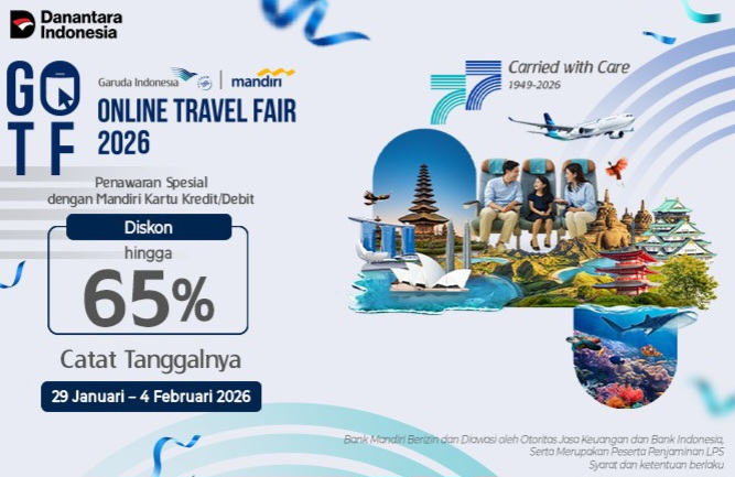 JAKARTA.PILARDAERAH.COM — Maskapai penerbangan nasional Garuda Indonesia menggandeng Bank Mandiri sebagai bank partner kembali menggelar Garuda Indonesia Online Travel Fair (GOTF) pertama di tahun 2026 dengan menghadirkan 140 ribu kursi untuk penerbangan domestik dan internasional diskon hingga 65%.