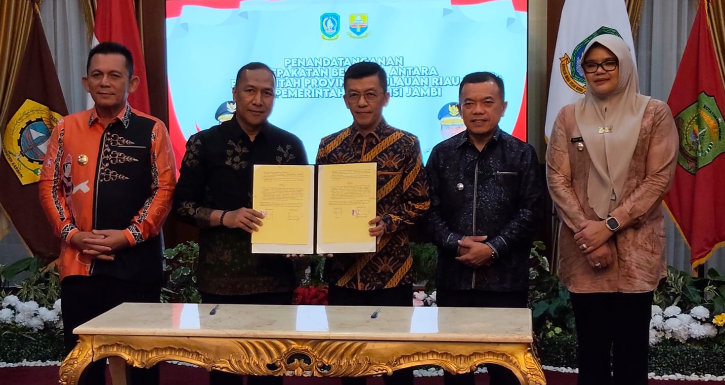 KEPRI.PILARDAERAH.COM — Gubernur Jambi Al Haris dan Gubernur Kepulauan Riau Ansar Ahmad menandatangani Kesepakatan Bersama (KSB) tentang pengelolaan bersama fasilitas pariwisata, ekonomi kreatif, dan kebudayaan di Pulau Berhala, Senin (13/4) malam di Tanjung Pinang. Kolaborasi ini bertujuan meningkatkan konektivitas ekonomi antarprovinsi Sumatera serta potensi ekspor ke Singapura melalui Kepri.