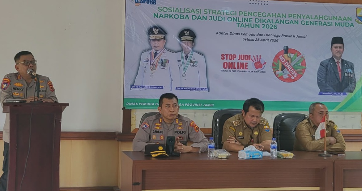 JAMBI.PILARDAERAH.COM – Upaya membentengi generasi muda dari pengaruh negatif perkembangan zaman terus diperkuat. Polda Jambi melalui Direktorat Binmas bersama Dinas Pemuda dan Olahraga (Dispora) Provinsi Jambi menggelar kegiatan Pembukaan Sosialisasi Strategi Pencegahan Penyalahgunaan Narkoba dan Judi Online di Kalangan Generasi Muda Tahun 2026, Selasa (28/4/2026).