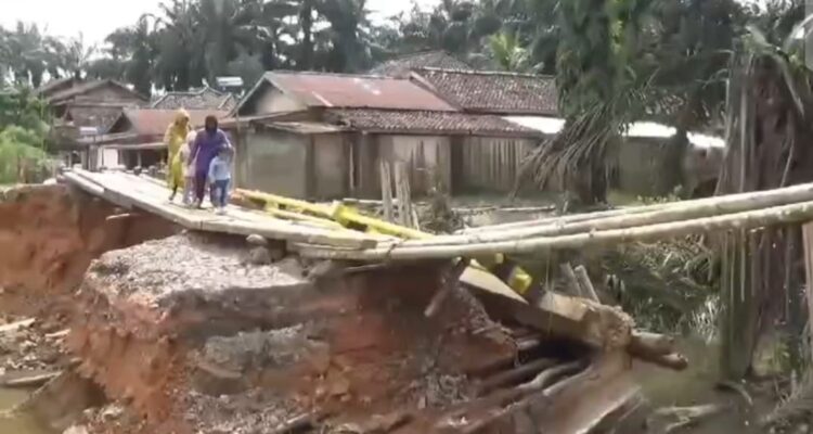 MUAROJAMBI.PILARDAERAH.COM — Akibat diterjang banjir, jembatan penghubung antar desa di wilayah Desa